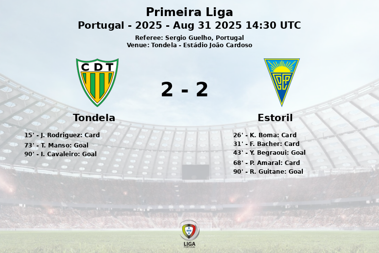 The second half continued with the same intensity. Tondela managed to equalize in the 73rd minute with a penalty goal from T. Manso. The end of the match was frantic. I. Cavaleiro put Tondela ahead in the 90th minute, but Estoril responded immediately with a goal from R. Guitane, assisted by J. Carvalho, securing the final draw.