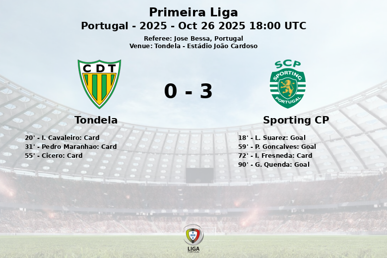 In the second half, P. Goncalves extended the lead for Sporting CP in the 59th minute, assisted by Trincao. Tondela, although trying to generate danger, could barely register 2 shots on goal throughout the entire match. The frustration became evident with a third yellow card. Sporting CP sealed the victory in stoppage time with a goal from G. Quenda, assisted by Matheus Reis, confirming their absolute dominance in the match. Sporting CP had 8 corners and Tondela only 2.