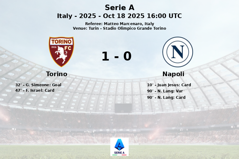 The match was not without tension, with yellow cards shown to Juan Jesus for Napoli in the 10th minute and to F. Israel for Torino in the 47th minute. In stoppage time, a goal by N. Lang for Napoli was disallowed by VAR due to offside, frustrating the visiting team’s hopes. Referee Matteo Marcenaro also cautioned N. Lang after the VAR review. Despite their superiority in possession and shots, Napoli failed to convert their chances, leaving Torino to celebrate a valuable victory at home.