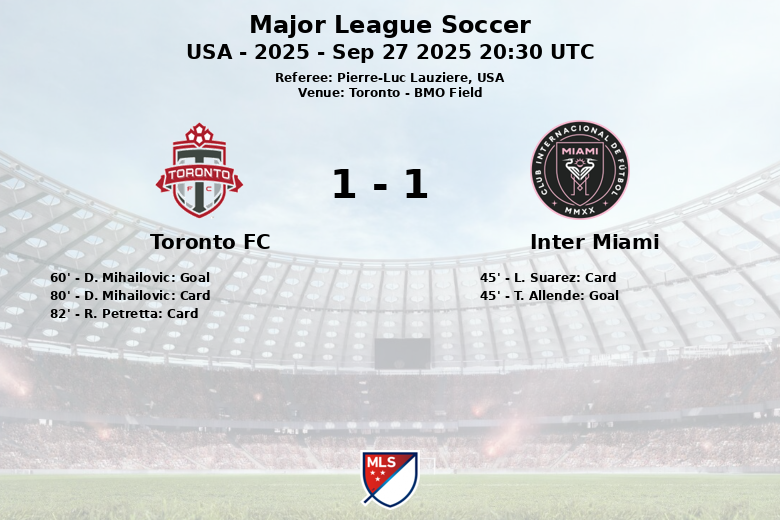 Inter Miami took the lead in the 45th minute with a goal from T. Allende. However, Toronto FC responded in the second half with a goal from D. Mihailovic in the 60th minute, leveling the score.