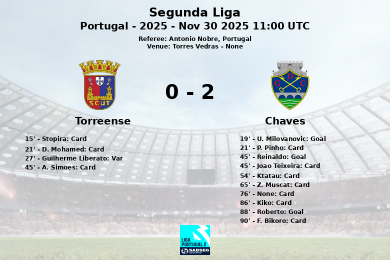 The first half continued to be eventful, with several yellow cards shown to both teams. A goal by Guilherme Liberato for Torreense was disallowed by VAR in the 27th minute. Just before halftime, Reinaldo extended Chaves’ lead by converting a penalty in the 45th minute, although no assist was reported. The situation worsened for Torreense with the expulsion of A. Simoes also in the 45th minute.