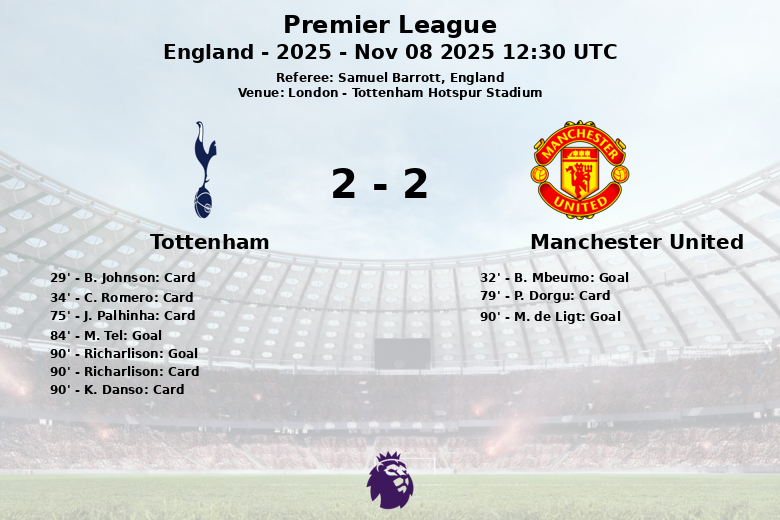 Manchester United took the lead in the 32nd minute thanks to a goal from B. Mbeumo, assisted by A. Diallo. However, Tottenham did not give up and, after a first half marked by yellow cards for B. Johnson and C. Romero, tirelessly sought the equalizer.