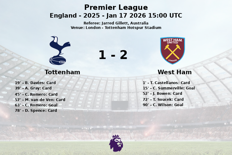 Just when it seemed that the match would end in a draw, C. Wilson of West Ham scored in the 90th minute, unassisted, to give his team the lead in the final moments. However, there was no time for more, and the score remained a draw. The match, marked by numerous fouls (17 by West Ham and 12 by Tottenham) and yellow cards, reflected the intensity and constant struggle of both teams to take the victory. Tottenham dominated possession, but West Ham proved effective in their attacks, turning the match into a vibrant spectacle for the spectators.