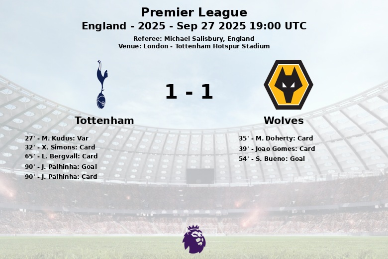 Referee Michael Salisbury had a busy afternoon, showing a total of 5 yellow cards (3 for Tottenham and 2 for Wolves) and overseeing the annulment of a crucial goal. The match concluded with 10 corners for Tottenham and 9 for Wolves, indicating the constant pressure in both areas.