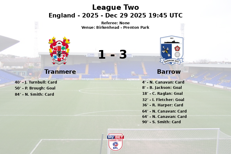 Barrow took an early lead with a goal from Jackson in the 8th minute, assisted by Fletcher. Raglan extended the lead in the 18th minute, followed by a goal from Fletcher in the 32nd minute, consolidating an initial dominance that stunned Tranmere.