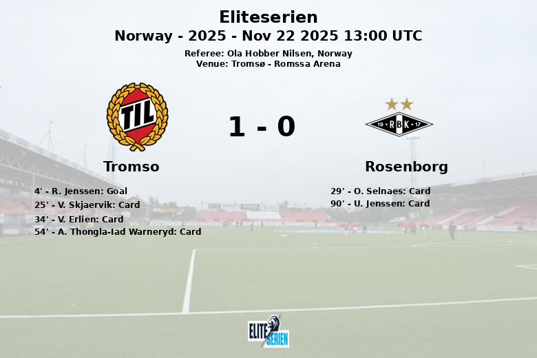 The match was characterized by play constantly interrupted by fouls and warnings. Referee Ola Hobber Nilsen showed a total of five yellow cards to Tromsø (V. Skjaervik, V. Erlien, A. Thongla-Iad Warneryd) and two to Rosenborg (O. Selnaes, U. Jenssen). Despite Rosenborg’s territorial dominance, their lack of precision in shots and Tromsø’s solid defense prevented them from equalizing or overcoming the score. Tromsø, for its part, knew how to maintain the advantage achieved at the beginning of the match and take all three points. The game took place in a tense atmosphere at the Romssa Arena in Tromsø, Norway on November 22, 2025.