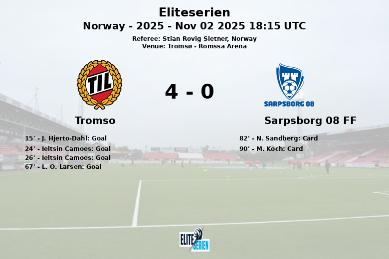 The first goal came early in the 15th minute, courtesy of J. Hjerto-Dahl. The pressure continued, and in the 24th minute, Ieltsin Camoes extended the lead with a penalty goal. Just two minutes later, Camoes scored again, solidifying Tromsø’s dominance. In the second half, L. O. Larsen added another goal for Tromsø in the 67th minute, assisted by Ieltsin Camoes.
