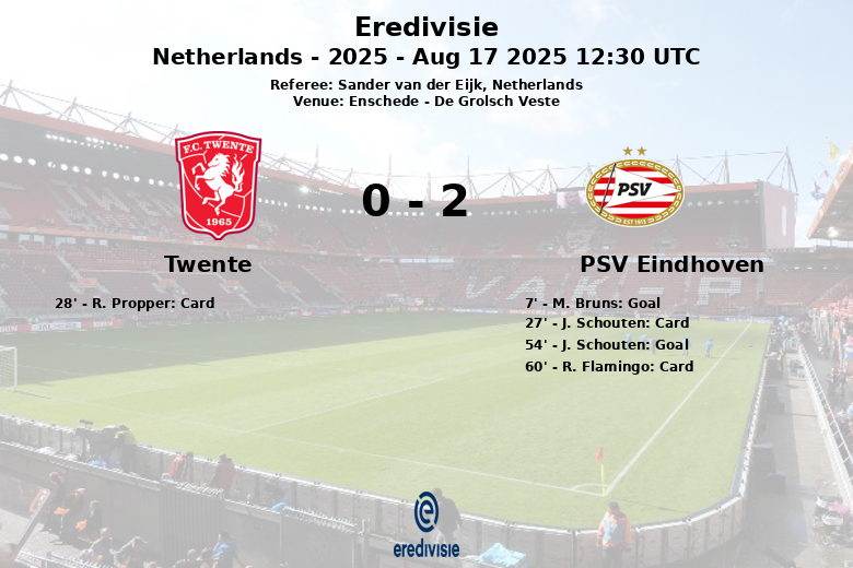 PSV opened the scoring early with an own goal by M. Bruns in the 7th minute. In the second half, J. Schouten extended the lead for the visitors in the 54th minute with an assist from Mauro Junior. The match was marked by intensity, reflected in the yellow cards shown to J. Schouten and R. Flamingo for PSV, and to R. Propper for Twente. Both teams committed a considerable number of fouls, 12 for PSV and 10 for Twente. Although Twente had more corners (8 compared to PSV’s 6), they failed to convert those opportunities. Despite Twente’s efforts, PSV Eindhoven managed to maintain their lead and secure the three points on their visit to Enschede. Sander van der Eijk officiated the match.