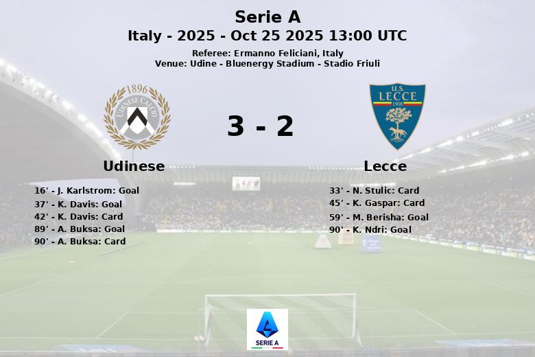 In the second half, Lecce managed to pull one back in the 59th minute with a goal by M. Berisha, reigniting their hopes. However, just when it seemed that the game was heading for a tight finish, A. Buksa scored for Udinese in the 89th minute, after an assist from V. Bayo, making it 3-1. Lecce didn’t give up, and K. Ndri scored in the 90th minute, reducing the difference to a single goal. In the final moments of the match, A. Buksa of Udinese also saw the yellow card.