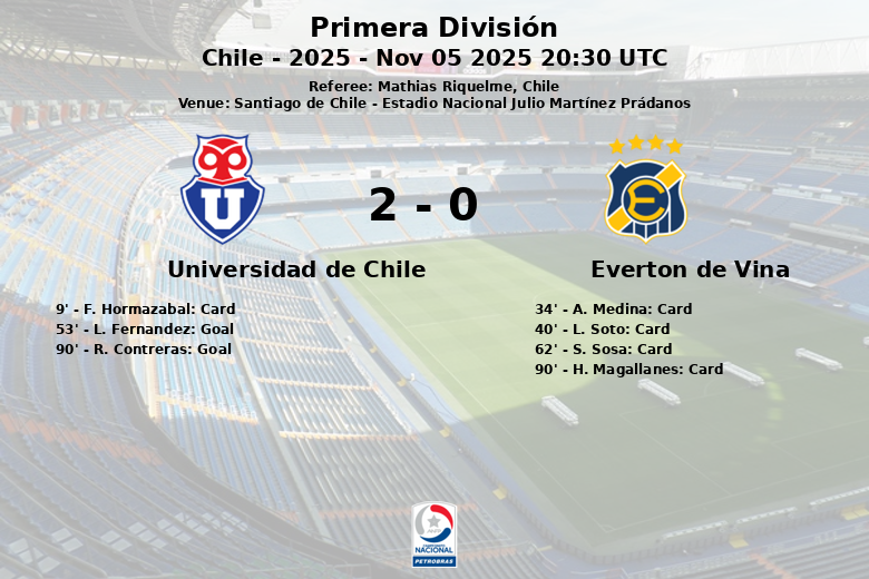 The match was characterized by a hard-fought game, with a total of 20 fouls committed between both teams. Referee Mathias Riquelme cautioned F. Hormazabal for Universidad de Chile, while A. Medina, L. Soto, S. Sosa, and H. Magallanes received yellow cards for Everton. The second goal, which sealed the victory for “La U”, came in the 90th minute thanks to R. Contreras, assisted by F. Salomoni, securing the three points for the home team. With 7 corners in their favor, Universidad de Chile demonstrated superiority in attack, contrasting with Everton’s 0 corners.