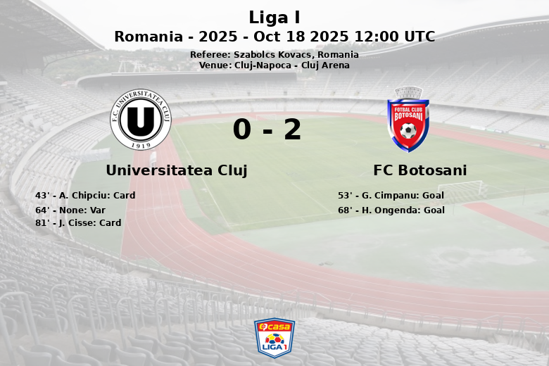 Cluj-Napoca, October 18, 2025 – FC Botoșani secured a victory at the Cluj Arena in a hard-fought match corresponding to Round 13 of the Romanian Liga I. The match, officiated by Szabolcs Kovacs, saw Botoșani prevail with an effective attacking game.