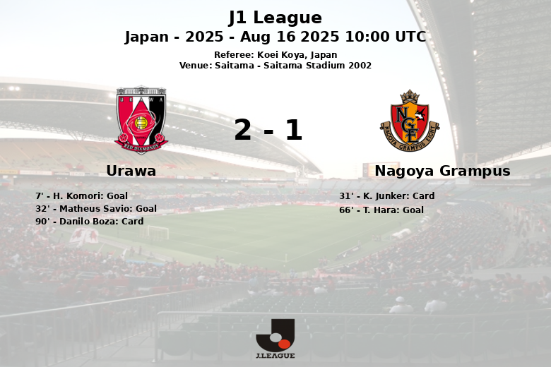Urawa took the lead early with a goal from H. Komori in the 7th minute, after an excellent assist from Matheus Savio. Savio extended Urawa’s lead in the 32nd minute, this time assisted by T. Kaneko. However, Nagoya Grampus did not give up and reduced the deficit in the 66th minute thanks to a goal by T. Hara, assisted by K. Nakayama.