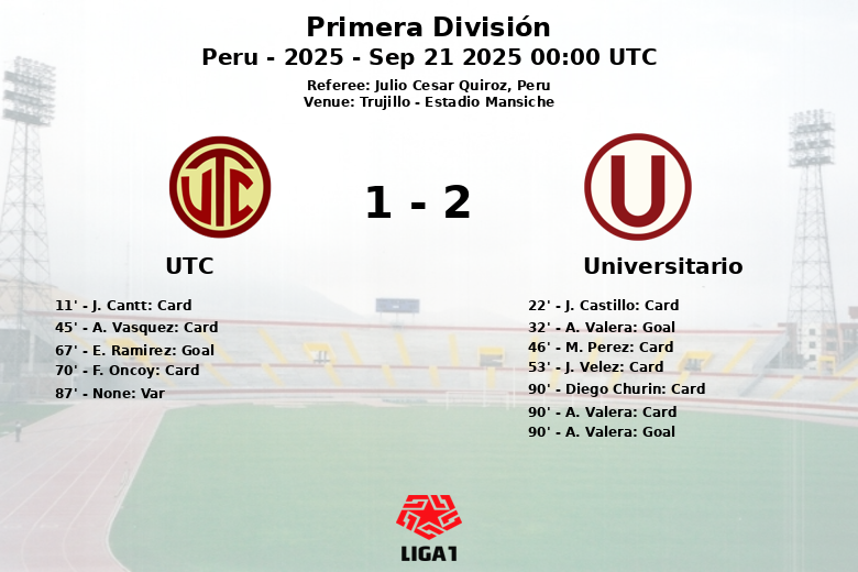 Trujillo, Peru – In a highly intense match with numerous cautions, Universitario managed to overcome UTC at the Estadio Mansiche with a final score of 2 to 1. The match, valid for the tenth round of the Apertura of the Peruvian First Division, was marked by physical play and refereeing decisions.