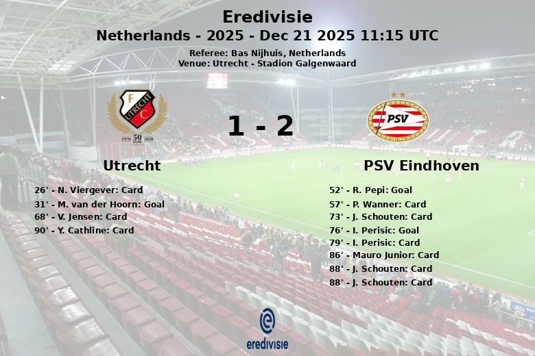 Utrecht took the lead in the 31st minute with a goal from M. van der Hoorn, assisted by S. Horemans. However, PSV Eindhoven responded in the second half. R. Pepi equalized in the 52nd minute, assisted by S. Dest. The comeback was completed in the 76th minute with a goal from I. Perisic, assisted by J. Veerman.