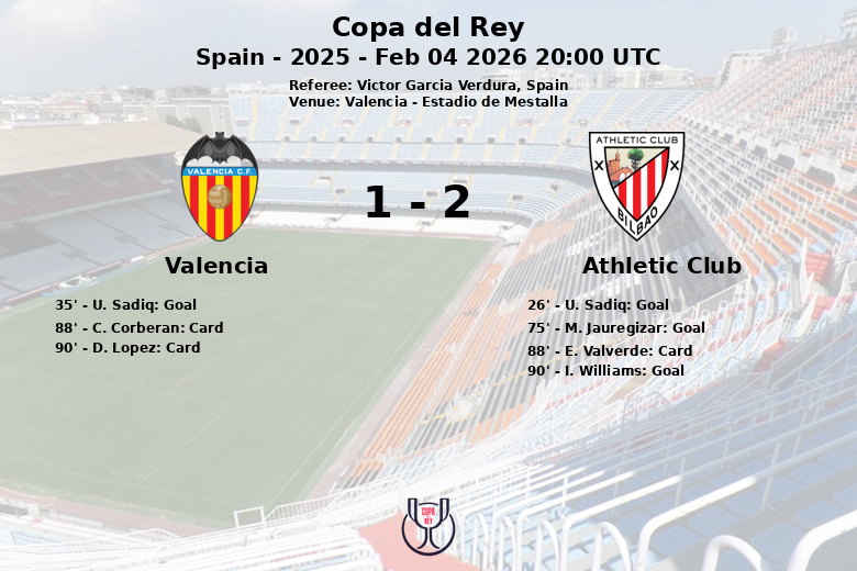 The match was marked by intensity, reflected in the yellow cards shown to E. Valverde and C. Corberan in the 88th minute, and to D. Lopez in the 90th minute. Valencia committed 13 fouls, while Athletic Club committed 8.