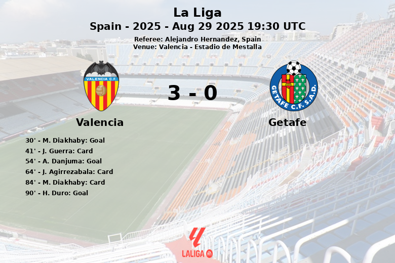The match continued with some interruptions and moments of tension, including a yellow card for J. Agirrezabala and M. Diakhaby of Valencia. In stoppage time, H. Duro sealed the victory for Valencia with a goal in the 90th minute, assisted by L. Ramazani, leaving the final result in favor of the home side. Despite the 8 corners earned by Valencia and 6 by Getafe, it was the effectiveness in the area that made the difference in the match.