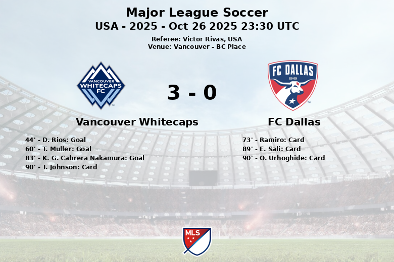 In the second half, T. Muller extended the lead from the penalty spot in the 60th minute. FC Dallas, with only one shot throughout the match, failed to trouble the home goalkeeper. To seal the victory, K. G. Cabrera Nakamura scored the third goal in the 83rd minute, assisted by R. Elloumi, consolidating Vancouver Whitecaps’ dominance.