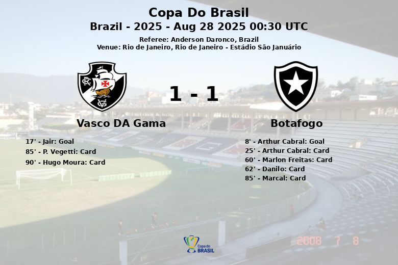 Rio de Janeiro, August 27, 2025 – Vasco da Gama and Botafogo played out an intense Carioca derby at the Estádio São Januário, in the quarter-finals of the Copa Do Brasil. The match, officiated by Anderson Daronco, ended in a draw, leaving the tie open for the return leg.