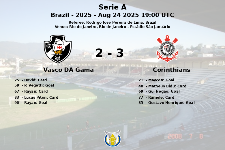 Vasco’s joy was short-lived, as Corinthians regained the lead in the 69th minute thanks to a goal from Gui Negao, assisted by Matheuzinho. When it seemed that the match was tilting towards the visitors, Gustavo Henrique extended Corinthians’ lead in the 85th minute with a goal assisted by R. Garro. However, Vasco showed their fighting spirit and Rayan managed to reduce the deficit in the 90th minute with a goal, assisted by C. A. Gomez, sealing the final draw.