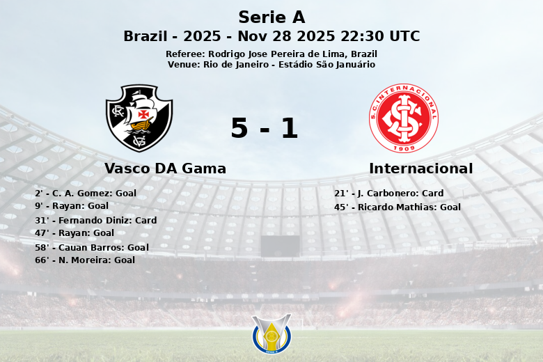 From the start, Vasco da Gama set the pace. C. A. Gomez opened the scoring in the 2nd minute, quickly followed by Rayan in the 9th minute, thanks to an assist from Paulo Henrique. Internacional responded before halftime with a goal from Ricardo Mathias in the 45th minute, assisted by A. Rodriguez, but Vasco’s momentum continued after the restart.