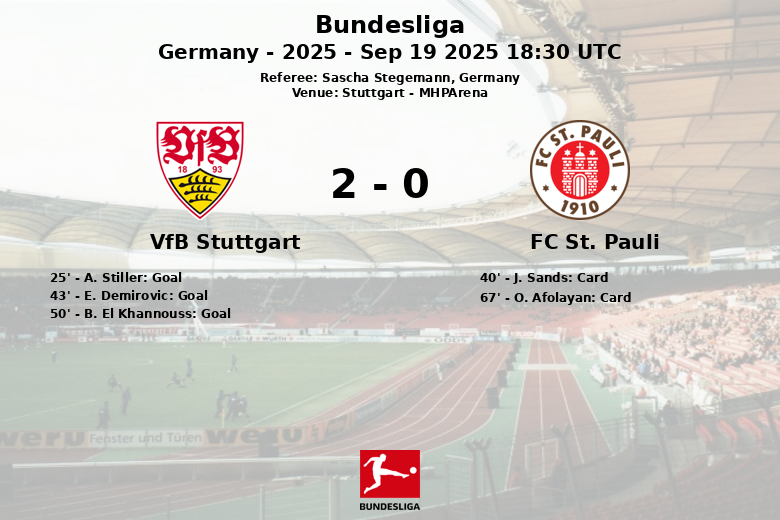 Stuttgart opened the scoring in the 25th minute, thanks to a goal by A. Stiller, who redeemed himself after missing a previous penalty in the same play. St. Pauli, who had already seen a yellow card to J. Sands in the 40th minute, suffered a major blow before the break with E. Demirovic’s goal in the 43rd minute, assisted by J. Leweling, extending Stuttgart’s lead.