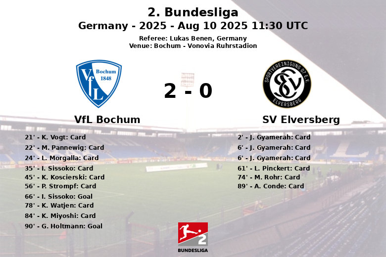 Bochum, Germany – VfL Bochum secured a hard-fought victory against SV Elversberg at the Vonovia Ruhrstadion in a match marked by intensity and numerous cautions. The match, corresponding to the second matchday of the 2. Bundesliga, ended with a 2-0 scoreline in favor of the home team.