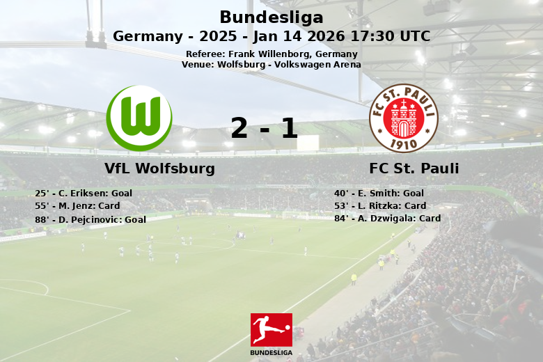 Wolfsburg dominated possession with 61%, but St. Pauli proved dangerous on the counter-attack. The score was opened in the 25th minute with a penalty goal converted by C. Eriksen for Wolfsburg. However, St. Pauli reacted and managed to equalize in the 40th minute thanks to a goal by E. Smith, assisted by A. Dzwigala.