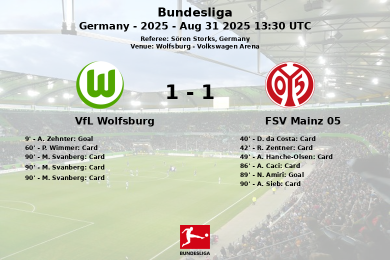 VfL Wolfsburg secured a hard-fought victory at home against FSV Mainz 05 in a tense Bundesliga match held at the Volkswagen Arena. The game, officiated by Sören Storks, was characterized by tension and a high number of cards, particularly in the final minutes.