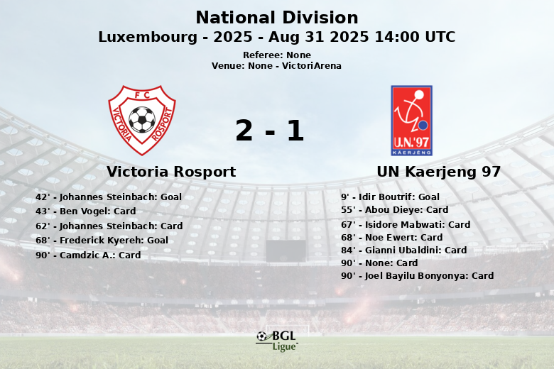 UN Kaerjeng 97 took an early lead in the 9th minute with a goal from Idir Boutrif from a penalty. However, the joy was short-lived, as Victoria Rosport reacted forcefully before halftime. Johannes Steinbach leveled the score in the 42nd minute, scoring a goal from open play. In the 68th minute, Frederick Kyereh made it 2-1, with an assist from Johannes Steinbach.