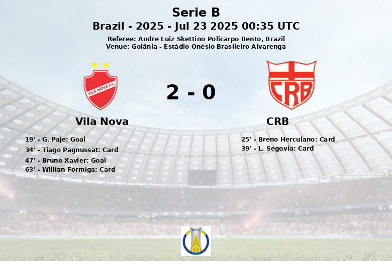 In the second half, Vila Nova extended their lead with a goal from Bruno Xavier in the 47th minute, assisted by Guilherme Parede. Despite CRB’s dominance in possession (72%) and their higher number of shots (22 compared to Vila Nova’s 13), they failed to convert their opportunities. The match was also marked by a yellow card to Willian Formiga of Vila Nova in the 63rd minute. Vila Nova had 5 corners, 12 fouls. CRB had 7 corners, 12 fouls. The match concluded with a victory for Vila Nova, with a score of two goals to zero.