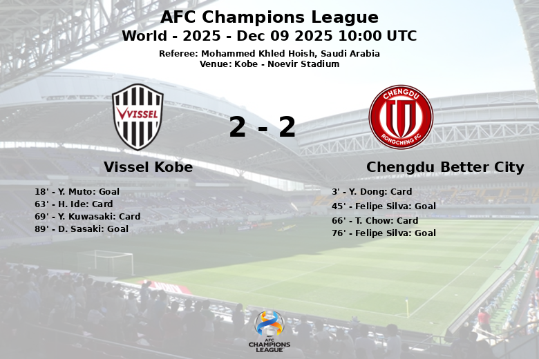 Kobe, Japan – In an action-packed match with plenty of back-and-forth, Vissel Kobe and Chengdu Better City drew in a game valid for the group stage of the AFC Champions League, played at the Noevir Stadium. The match, refereed by Mohammed Khled Hoish from Saudi Arabia, saw both teams fight relentlessly for the victory.