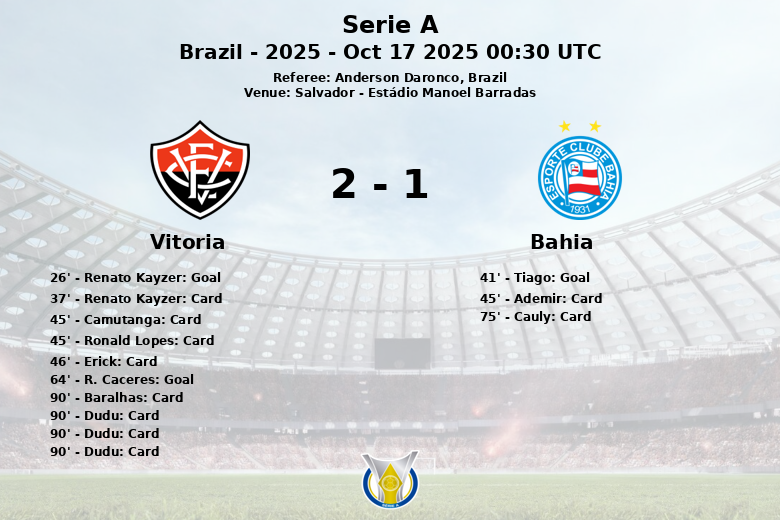 Vitoria took the lead in the 26th minute thanks to a penalty converted by Renato Kayzer. However, Bahia responded before halftime with a goal from Tiago in the 41st minute, assisted by Nicolas Acevedo. The first half concluded with a flurry of yellow cards, reflecting the vehemence with which every ball was contested.
