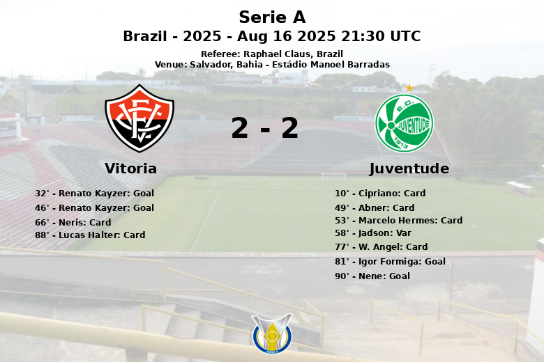 Despite the even possession (50% for each team), Vitoria had more shots (17 against 13), although both teams had the same number of shots on target (4). The match was characterized by a high number of fouls (14 by Juventude and 9 by Vitoria) and cards. In addition to the expulsion of Cipriano for Juventude, Neris was expelled for Vitoria in the 66th minute. VAR also played a role by disallowing a goal from Jadson for Juventude due to offside in the 58th minute.
