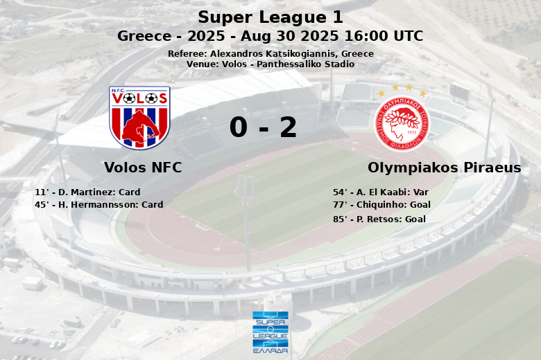 Volos, while struggling to maintain control, received two yellow cards, one in the 11th minute to Card for a foul by D. Martinez and another in the 45th minute to Card for a foul by H. Hermannsson. In the second half, the VAR disallowed a goal by A. El Kaabi of Olympiakos for offside in the 54th minute. Volos’ resistance held until the 77th minute, when Chiquinho opened the scoring for Olympiakos, assisted by G. Strefezza. Subsequently, P. Retsos extended the lead in the 85th minute, assisted by Chiquinho, sealing the victory for the Piraeus team.