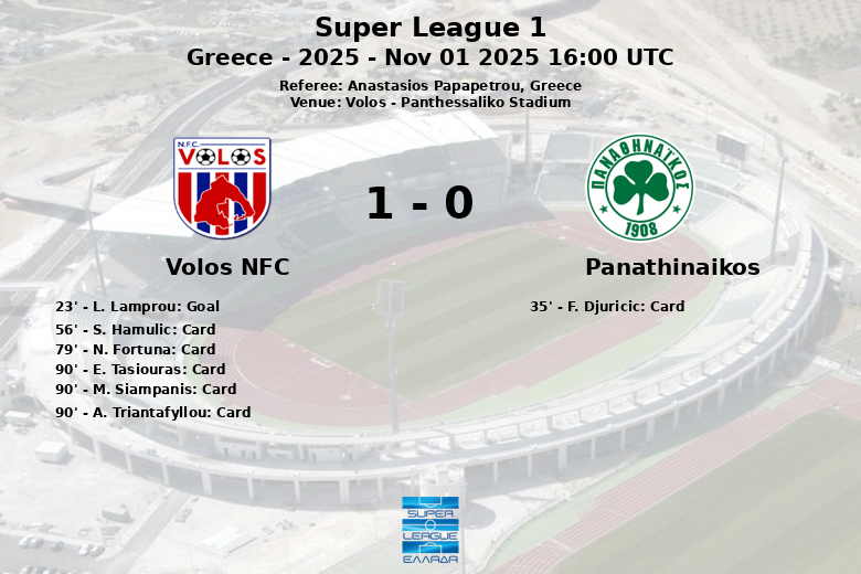 Volos, Greece – In a hard-fought match at the Panthessaliko Stadium, Volos NFC secured a significant victory over Panathinaikos, a result sure to surprise many. The match, part of Super League 1 Round 9, was decided by a single goal from L. Lamprou in the 23rd minute, assisted by G. Mygas.