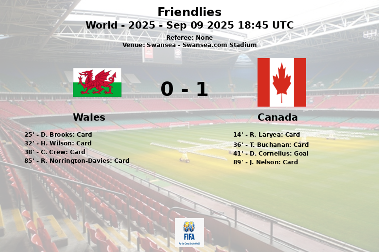 Despite Wales dominating possession with 63%, Canada managed to be more effective in attack, generating 12 shots, although only two of them found the target. The decisive goal came in the 41st minute when D. Cornelius capitalized on an opportunity to put Canada ahead, scoring the only goal of the match.
