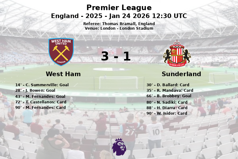 West Ham vs Sunderland Jan 24 2026 12:30 UTC