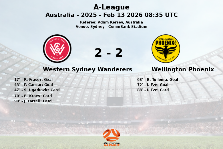 However, Wellington Phoenix did not give up. B. Tuiloma scored for the visiting team in the 68th minute with an assist from C. Armiento, kicking off an electrifying comeback. The equalizer came in the 72nd minute thanks to a goal by I. Eze. The match was characterized by physical play, with several yellow cards shown, two for the Wanderers (S. Ugarkovic in the 47th minute and B. Kraev in the 70th minute, J. Farrell in the 90th) and one for the Phoenix (I. Eze in the 88th minute).