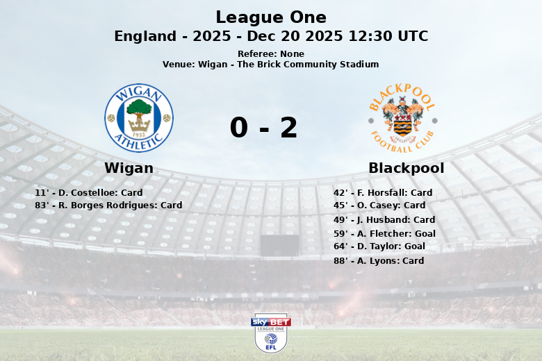 The goals came in the second half. A. Fletcher opened the scoring for Blackpool in the 59th minute, assisted by D. Taylor. Just five minutes later, in the 64th minute, D. Taylor extended Blackpool’s lead, this time assisted by A. Fletcher. Despite Wigan’s efforts, which attempted to create danger with 20 shots, only 3 were on target. Blackpool, with fewer shots, demonstrated greater accuracy. The match concluded with another yellow card for Blackpool (A. Lyons) and one for Wigan (R. Borges Rodrigues). Blackpool ultimately secured the win.