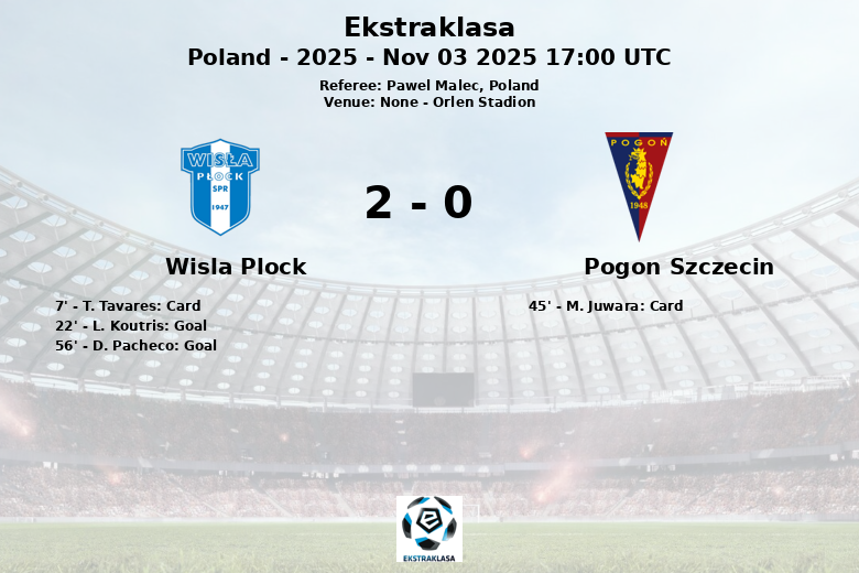 Wisla Plock, playing at home, showed defensive solidity despite conceding possession to Pogon Szczecin (68% against 32%). The first incident of the match was a yellow card for T. Tavares of Wisla Plock in the 7th minute. The surprise came in the 22nd minute when L. Koutris of Pogon Szczecin scored an own goal, giving Wisla Plock the lead. Pogon attempted to equalize before the break, but was met with a well-organized defense. M. Juwara of Pogon Szczecin received a yellow card just before the end of the first half.