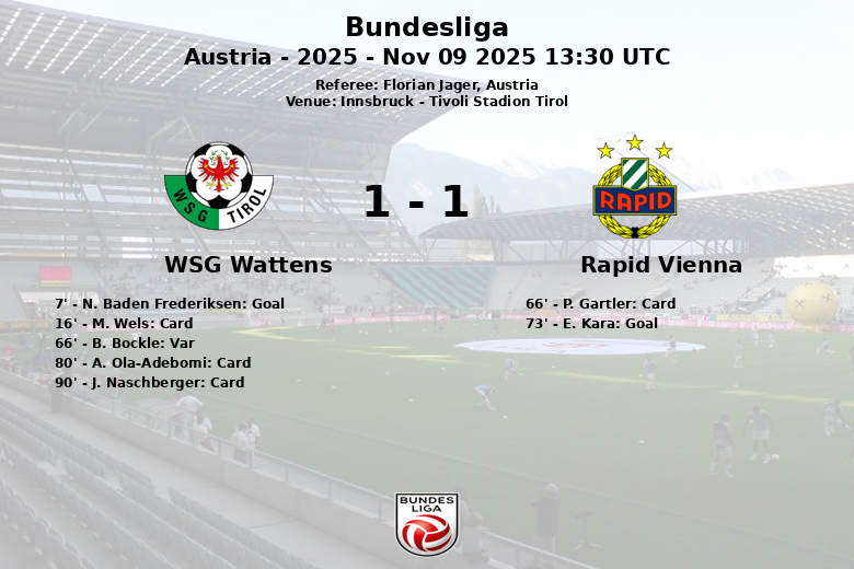 Innsbruck, Austria – In a hard-fought match at the Tivoli Stadion Tirol, WSG Wattens and Rapid Vienna drew in a game corresponding to matchday 13 of the Austrian Bundesliga. The match, officiated by Florian Jager, saw a first half favorable to WSG Wattens, who took an early lead in the 7th minute with a goal by N. Baden Frederiksen after an assist from T. Sabitzer. The home team showed defensive solidity and capitalized on their attacking opportunities.