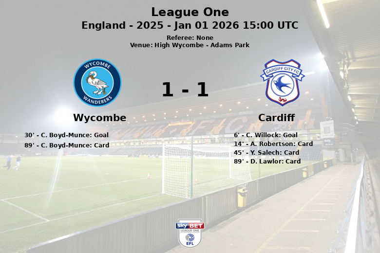 High Wycombe, England – In a match corresponding to matchday 24 of League One, Wycombe Wanderers and Cardiff City drew one-all at Adams Park. The match, played in a tense atmosphere, saw Cardiff take an early lead thanks to a goal by C. Willock in the 6th minute, assisted by R. Wintle. However, Wycombe reacted and managed to equalize in the 30th minute with a goal from C. Boyd-Munce.