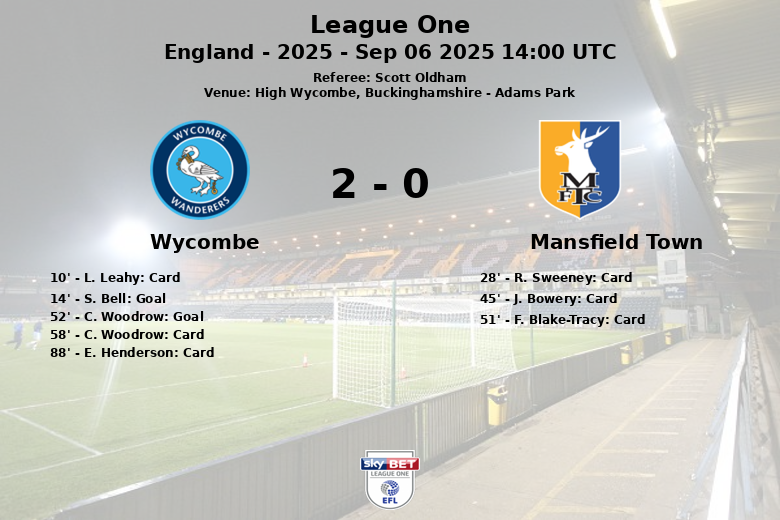High Wycombe, Buckinghamshire – Wycombe Wanderers defeated Mansfield Town at Adams Park with a final score of 2 to 0. The match, part of the seventh round of League One, was notable for a high number of yellow cards and balanced possession.
