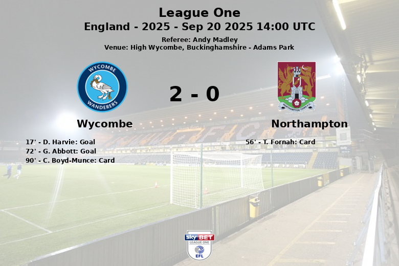 High Wycombe, Buckinghamshire – Wycombe Wanderers secured a solid home victory against Northampton Town in a match played at Adams Park. Under the watchful eye of referee Andy Madley, the home side dominated much of the encounter, culminating in a final score of two to zero.