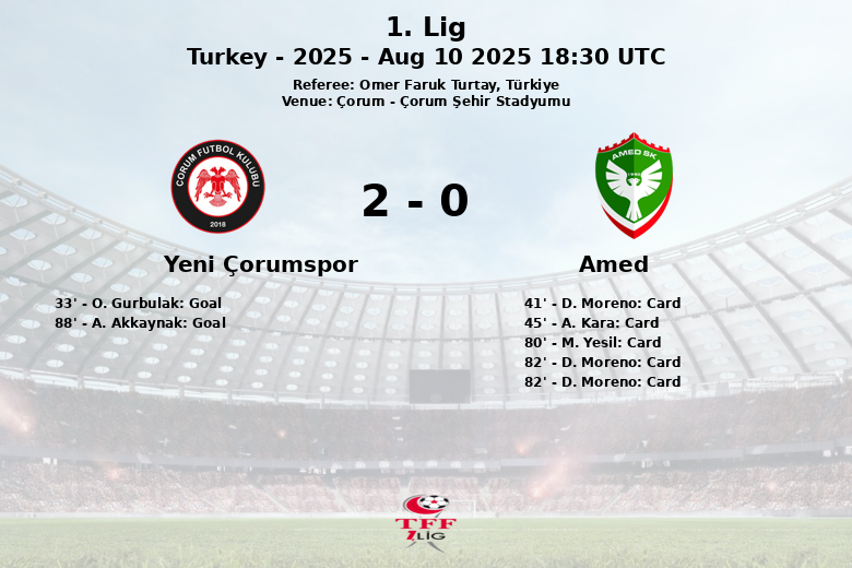 Amed also accumulated a total of four yellow cards (D. Moreno x2, A. Kara and M. Yesil). On the other hand, Yeni Çorumspor maintained discipline, avoiding cautions and expulsions. The home team sealed the victory with a goal from A. Akkaynak in the 88th minute, assisted by E. Karadag.