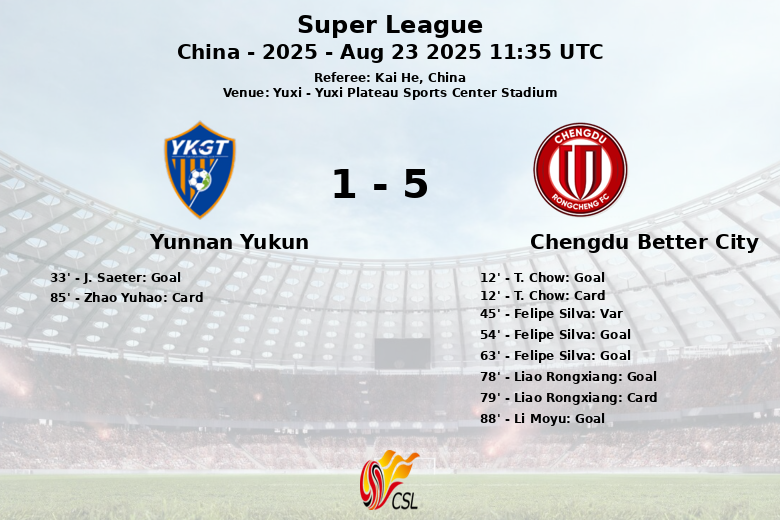 Chengdu Better City showed their ambition from the start, opening the scoring in the 12th minute with a goal by T. Chow, who also received a yellow card in the same play. Yunnan Yukun responded with a goal by J. Saeter in the 33rd minute, leveling the score and raising expectations for a more balanced match.