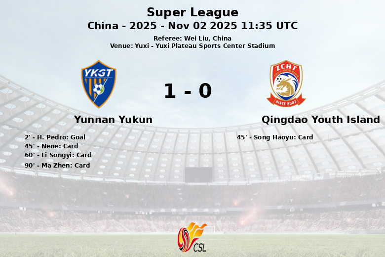 Yuxi, China – In a match corresponding to Round 29 of the Chinese Super League, Yunnan Yukun achieved an important home victory against Qingdao Youth Island. The only goal of the match came early, in the 2nd minute, thanks to a precise finish by H. Pedro after an assist from O. Taty Maritu.