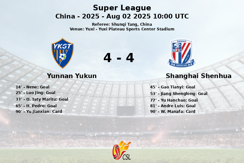 The match continued at a frenetic pace, and H. Pedro put Yunnan Yukun back in the lead. But the local joy was short-lived, as Yu Hanchao and Andre Luis, the latter from a penalty, sealed the comeback for Shanghai Shenhua. The match ended in a draw, a reflection of the constant struggle and offensive display of both teams.