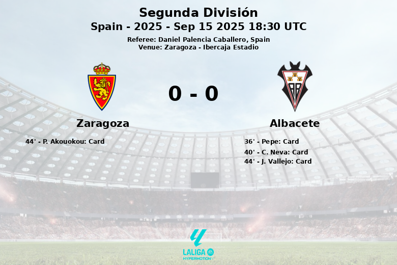 The match, played at the Ibercaja Estadio in Zaragoza, was characterized by a scrappy game with many fouls, 16 committed by Albacete and 8 by Zaragoza. The referee, Daniel Palencia Caballero, showed four yellow cards, one for Zaragoza and three for Albacete. The most notable incidents occurred near the end of the first half, with several consecutive bookings. Both teams generated several corners, 3 for Zaragoza and 6 for Albacete. Ultimately, the match ended in a draw, leaving a bittersweet feeling for both teams on this matchday of the Segunda División.