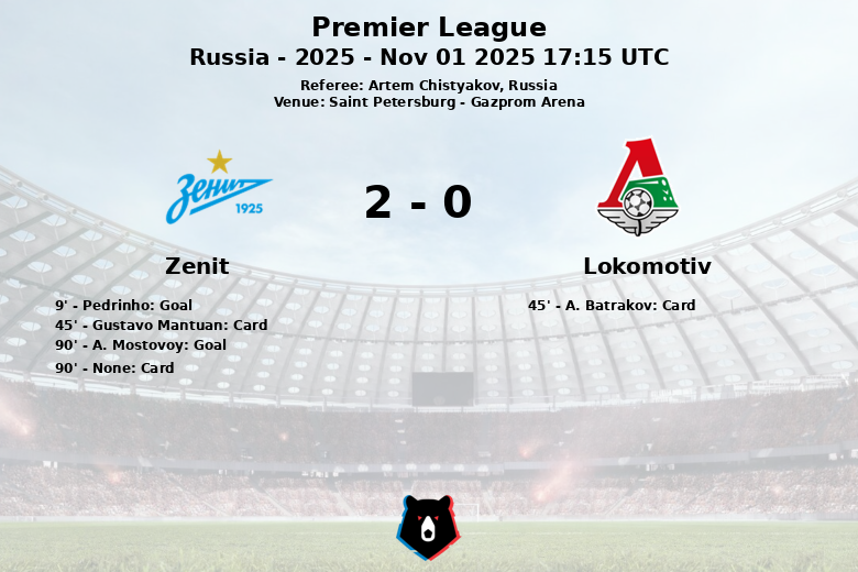 Zenit opened the scoring early, in the 9th minute, with a goal by Pedrinho, assisted by M. Glushenkov. This initial goal gave confidence to the home team, which controlled much of the first half. However, Lokomotiv did not back down and constantly sought the equalizer. The intensity of the game was evident with yellow cards shown to A. Batrakov of Lokomotiv and Gustavo Mantuan of Zenit just before halftime.